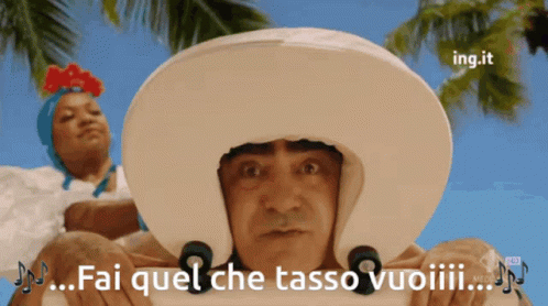 Elio E Le Storie Tese in the iconic ING ad, singing 'Fai quel che tasso vuoi' with a humorous twist.