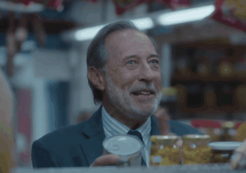 Eliseo, played by Guillermo Francella, smiles and points while holding a can in a supermarket aisle.