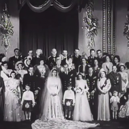 Queen Elizabeth II and Prince Philip's royal wedding party, a historic black and white gathering of British royalty.