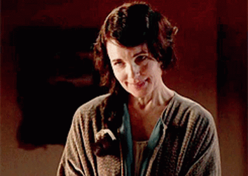Elizabeth McGovern smiles warmly, wearing a cozy sweater and blue shirt, looking directly at the camera.