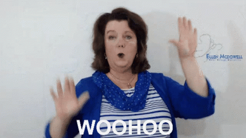 Ellen Mc Dowell enthusiastically exclaims 'Woohoo' with a happy dance, celebrating with raised hands.