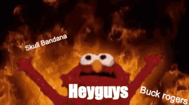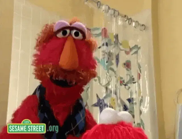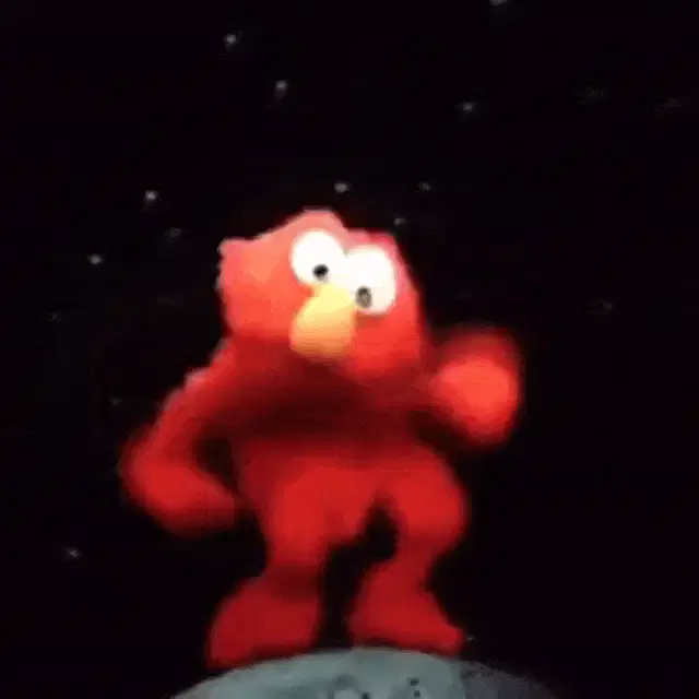 Elmo from Sesame Street looking around with his characteristic wide eyes and orange nose.