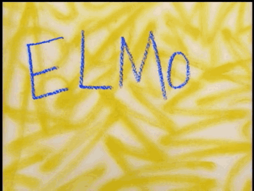 Elmo draws the letters 'E' and 'L' with a blue crayon on a yellow background, then reveals a window.