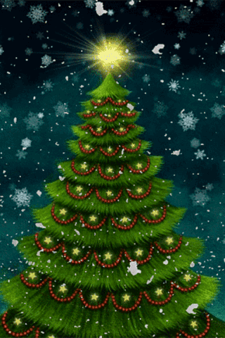 Animated Christmas tree with a star on top, decorated with beads, as snowflakes fall.