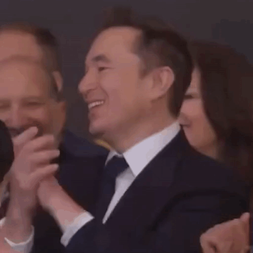 Elon Musk Uzbek lookalike claps, gives a thumbs up, and laughs heartily at an event.