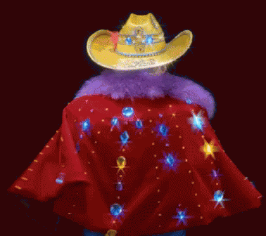 Elreydelasofertas Reydeofertas poses in his iconic sparkly cowboy hat and flamboyant red cape.