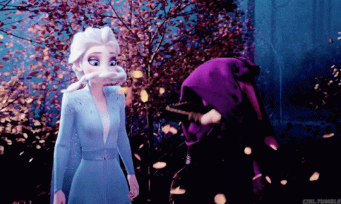 Elsa and Anna from Frozen 2 stand in a magical, windy forest with autumn leaves falling around them.