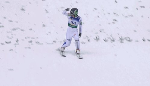 Ema Klinec celebrates her ski jump, raising her arm and clapping her hands in the snowy landscape.