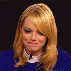 Emma Stone makes an embarrassed face, then smiles, wearing a blue shirt with a white collar.