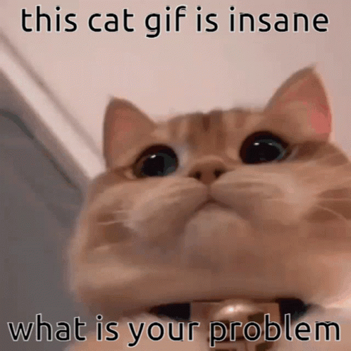Emery Cat stares intensely with wide eyes, accompanied by the text 'what is your problem'.