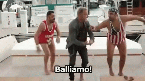 Amedeo Grieco and Pio D'Antini from Emigratis dance on a boat, exclaiming 'Let's dance!'