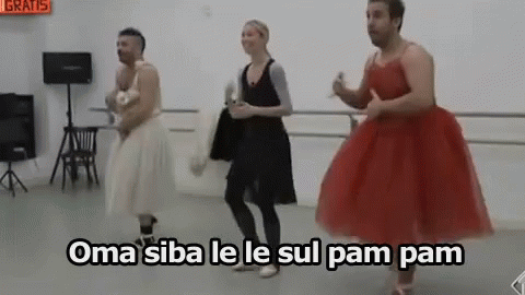 Amedeo Grieco and Pio D'Antini, along with a woman, comically dance in tutus to 'Oma siba le le sul pam pam' from Emigratis.