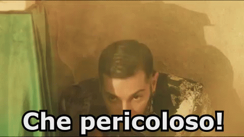 Italian rapper Emis Killa (Emiliano Rudolf Giambelli) in a dramatic scene with the caption 'Che pericoloso!'.