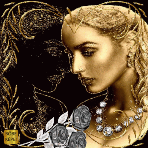 A striking golden art piece featuring two women, silver roses, and shimmering glitter.