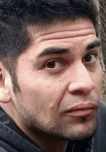 Emmo, a man with a beard, looks around with a suspicious and curious expression.