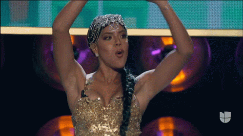 Francisa Lachapel dancing energetically in a gold dress on stage for Tu Cara Me Suena.