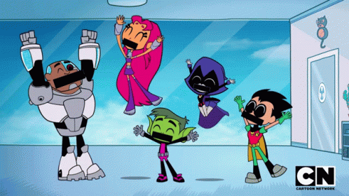 Excited Teen Titans Cyborg, Starfire, Beast Boy, Raven, and Robin with mouths covered, a happy moment. Slade is also featured.
