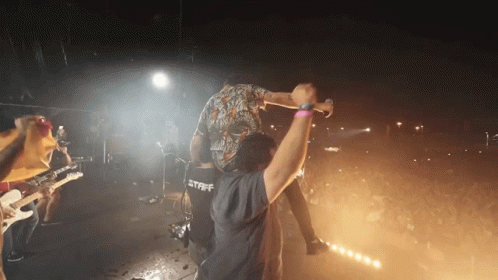 The band Taburete performs live, with a member being lifted by a staff member, celebrating with an excited crowd.