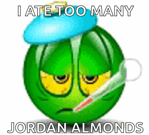 A sick green emoji with a thermometer and ice pack laments, 'I ate too many Jordan almonds.'