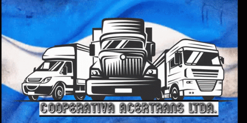 Logo for Cooperativa Acertrans Ltda. featuring three trucks against a blue and white flag background.