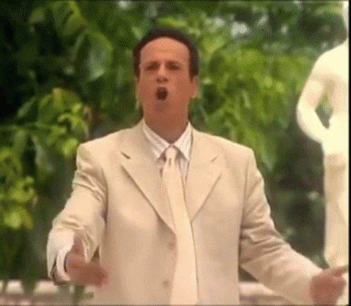 Haris Romas, as Popotas from Empros Piso, makes a funny face while standing in a suit outdoors.