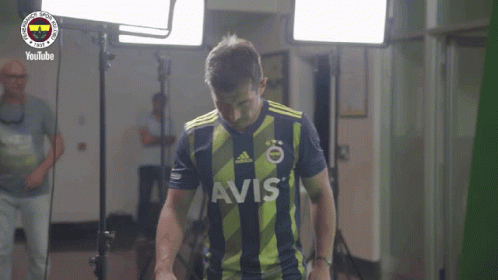 Emre Belözoğlu walks in his Fenerbahçe Adidas kit with 'AVIS' sponsor logo, preparing for a shoot.