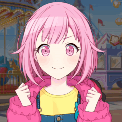 Emu Otori from Project Sekai smiles brightly in her pink jacket and overalls at an amusement park.