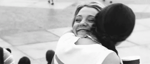 Two best friends share a warm, joyful embrace in this heartfelt black and white moment.