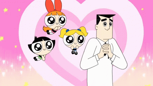 Professor Utonium looks smitten as he stands with Blossom, Bubbles, and Buttercup from The Powerpuff Girls.