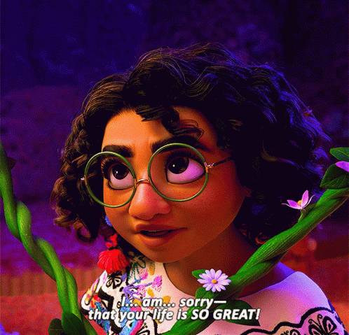 Mirabel Madrigal from Encanto exclaims 'I am sorry that your life is SO GREAT!' with an exaggerated expression.