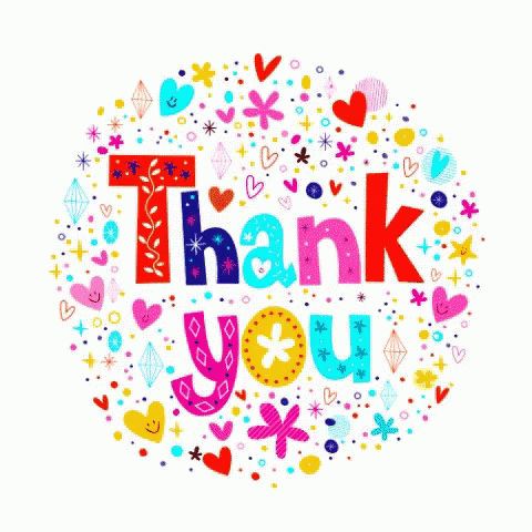 A vibrant and encouraging 'Thank You' message, adorned with colorful hearts, stars, and flowers in a decorative circular design.