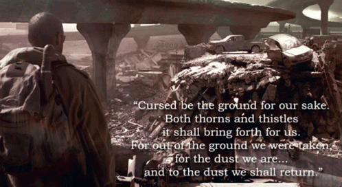 Denzel Washington in Book of Eli, standing amidst ruins with a powerful quote about the end of the world.