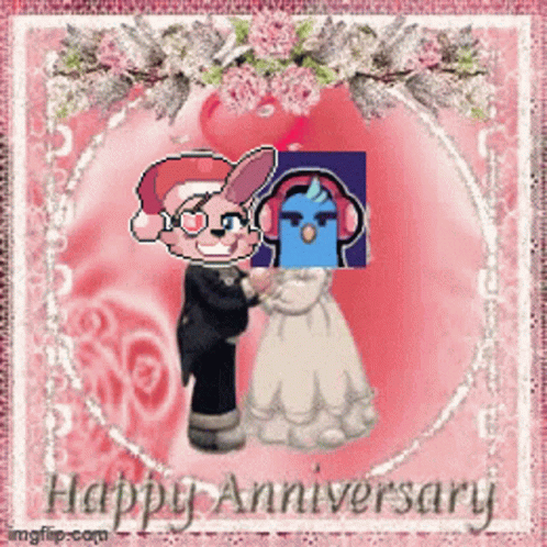 An anniversary card featuring cartoon characters El Pichon and Skye from ENDFALL, celebrating a happy anniversary.