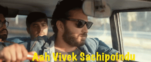 A man in sunglasses drives a car with the meme 'Aah Vivek Sachipoindu' displayed, featuring Vivek.