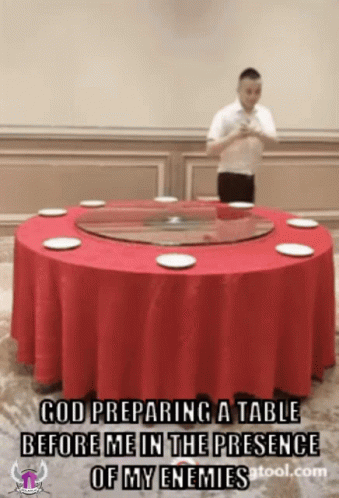 Man performs a tablecloth trick, revealing a red table and setting plates, referencing 'God preparing a table'.