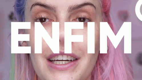 Karen Bachini with pink and blue hair smiles at the camera, with the Portuguese word "ENFIM" (Finally) displayed.