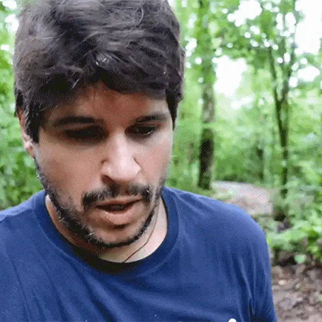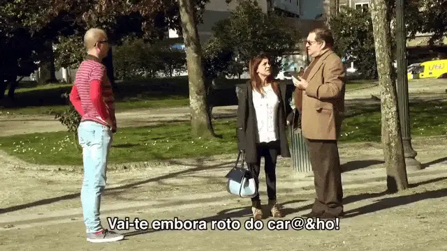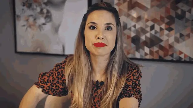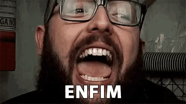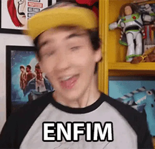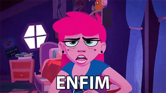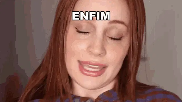 Karen Bachini with the word 'Enfim' (Anyway) displayed on screen, showing a close-up of her face.