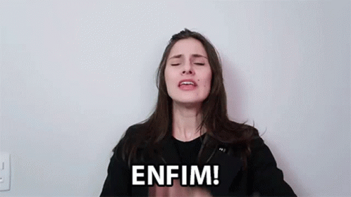 Woman makes a funny, exasperated face with 'ENFIM!' caption, from 'Operacao Cinema' content.