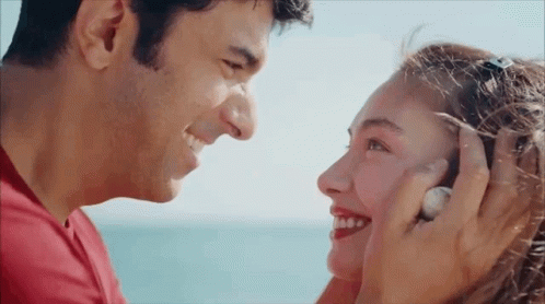 Engin Akyürek shares a tender forehead kiss with Narsan, both smiling happily by the sea.