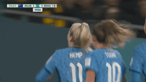 Lauren Hemp and the England Lionesses celebrate a goal against Australia, taking a 2-1 lead in the 70th minute.