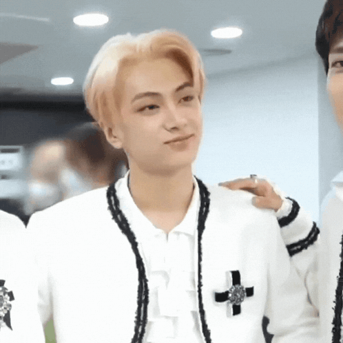 Enhypen's Jay laughs and smiles, looking shy and flustered in a white jacket with black trim.