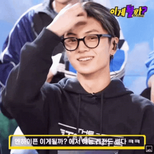 ENHYPEN's Jay, also known as Park Jongseong, adjusts his hair while wearing glasses and a hoodie.