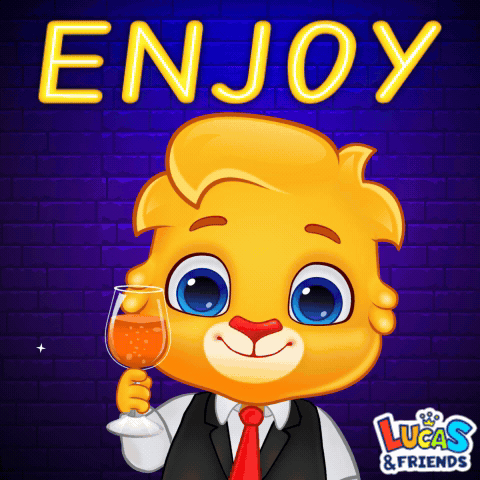 Lucas from Lucas & Friends raises a glass to say 'Enjoy Your Day!' with neon 'ENJOY' sign.