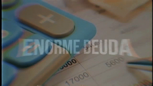 A calculator on financial papers, highlighting 'Enorme Deuda' (Enormous Debt) and financial struggles.