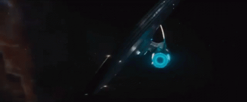 The USS Enterprise performs a dynamic evasive maneuver through the dark expanse of outer space.