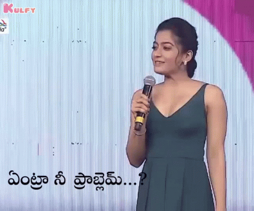 Rashmika Mandanna asks 'What's your problem?' while speaking into a microphone at an event.