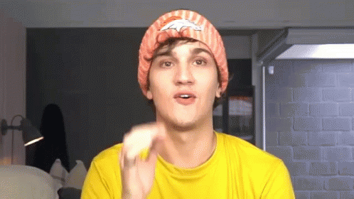 Christian Figueiredo, wearing a beanie and yellow shirt, looks shy and embarrassed.