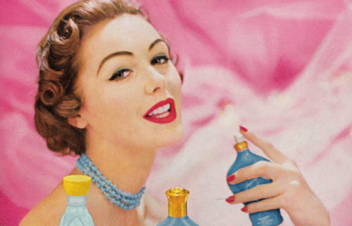 Women celebrating beauty and empowerment with Avon products, featuring perfume and makeup application.