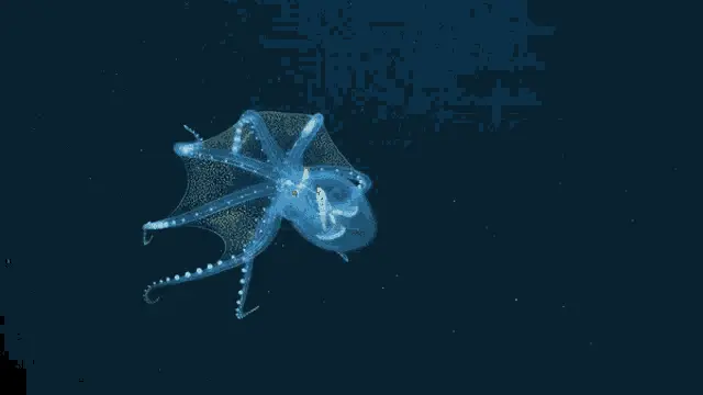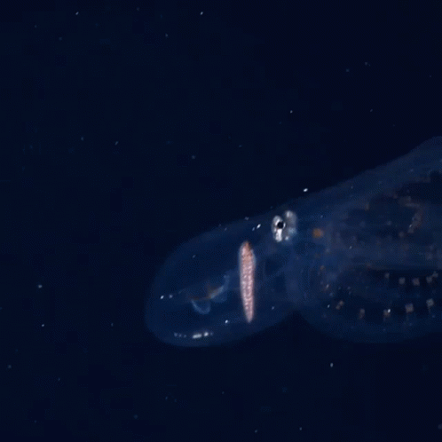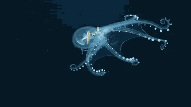 A mesmerizing Glass Octopus (Vitreledonella Richardi) gracefully swims in the dark deep sea, showcasing its transparent body.