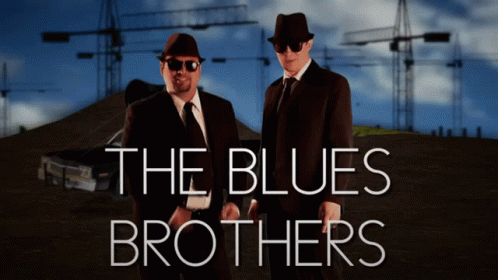 The Blues Brothers title card featuring two men in suits, associated with Erb and Rich Alvarez.
